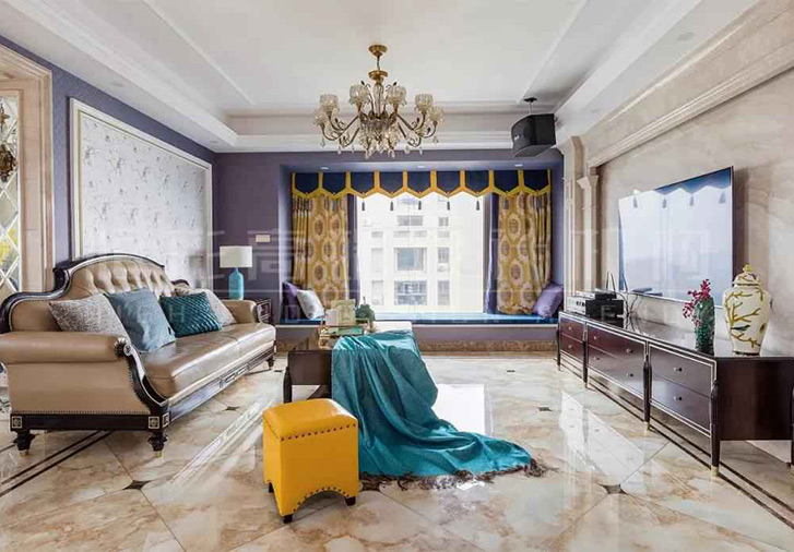 客厅空间仿古地砖采用网格铺法,简单大气,搭配深色实木家具以及皮质沙发,整个客厅给人的感觉就是气派、大气、恢弘。软配上采用孔雀蓝+姜黄色的搭配,将一种复古而又尊贵的家居氛围体现出来。金属元素的大量修饰,更是强化了轻奢的味道。