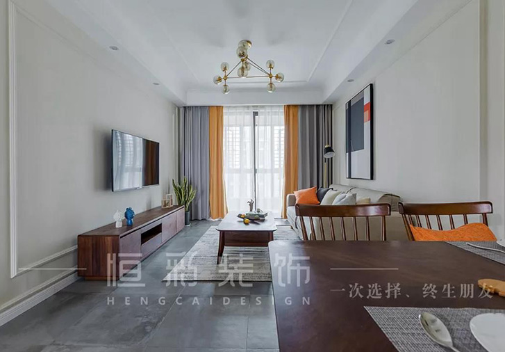 米灰色布艺沙发质感更加柔软舒适,搭配现代风简约挂画,橙色作为整个空间的跳色十分显眼,为整个中性色的空间增添了一抹亮色。