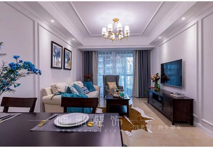客厅空间以白色作为背景色,蓝色为主角色。吊顶、墙面以石膏线打框作造型,简单耐看。蓝色作为整个空间的点缀,从沙发抱枕到墙上挂画,形成一个色彩的延伸。