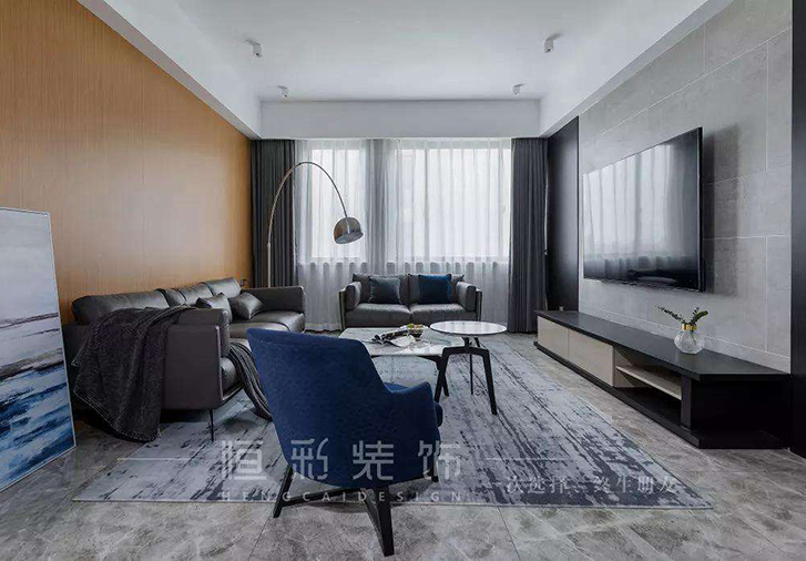 客厅空间整体采用中性色作为整个空间的主题色。灰色皮质沙发,搭配深蓝色的单人沙发椅,大量纯色的使用,令空间色块简洁明了。