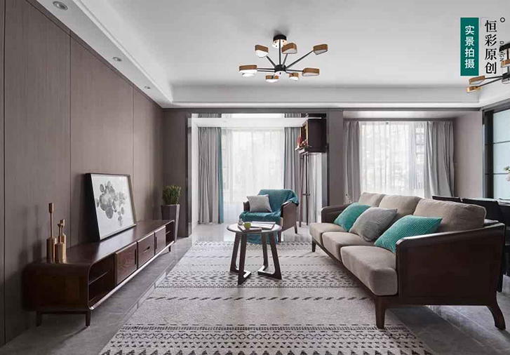 胡桃木色家具简单大气,浅棕色布艺沙发软垫搭配绿色抱枕,对比度很高。