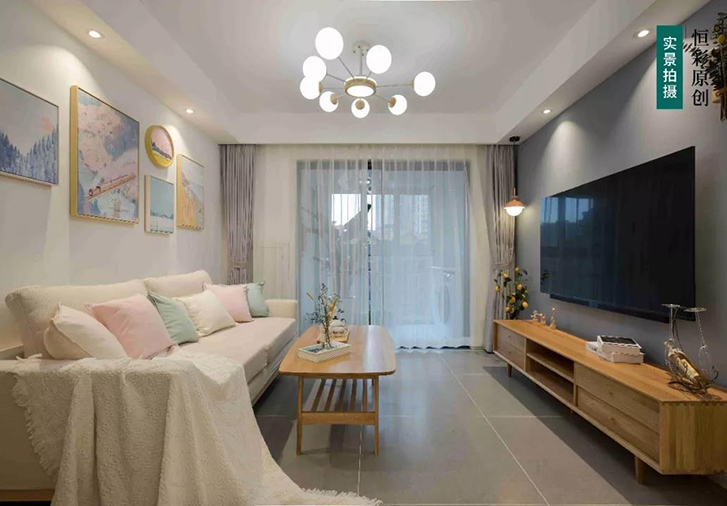 客厅主色以米白色为主,米白色的沙发、背景墙,搭配非常淡的粉色、绿色,营造马卡龙色的意境,玩转小清新。