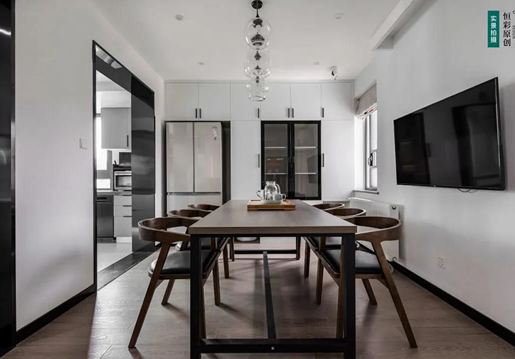 因为舍弃了客厅,所以将电视机装在了餐厅边上,一家人可以做在一起边吃饭边看电视,也是不错的体验。