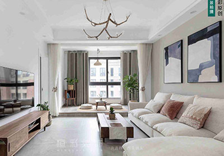 绒面的布艺沙发,在质地上给人一种柔软舒适的触感以及视觉体验感。加上米色的温暖色调,迎面扑来的是令人神往的惬意心境。阳台采用地台设计,抬高地面,利用地板的质感来书画一个写意的休闲区。别致的树枝顶灯为整个北欧小家增添了几分森系小清新的味道。