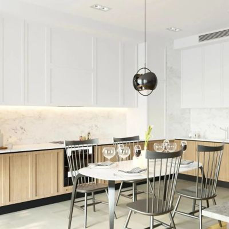 公寓整体大面积的冷色调,整体追求干净纯粹的极简风格。书房则选用了暖调的胡桃木让空间呈现的更加生动立体。
