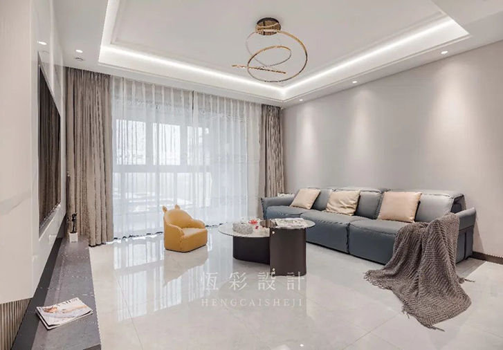 局部吊顶,主灯+内嵌筒灯+灯光带的布局营造出光影丰富的层次感,加上自然光源的融入,尽显温馨。