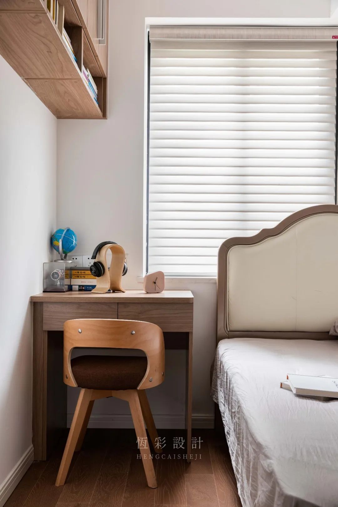 放弃了凌乱的柜体布局,保留基本的休息+学习+储物功能,尽显整洁。