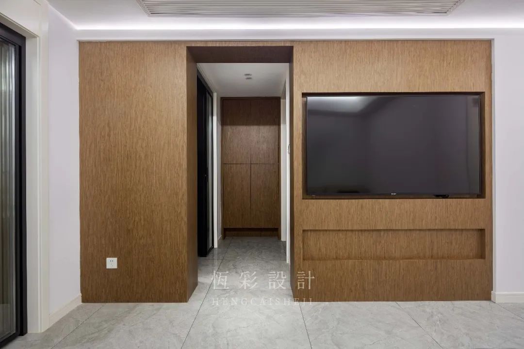 电视背景墙木饰元素延伸,外观统一大方,内嵌的电视也延续了简洁的风格。改变传统占地的电视机柜,而以一体式部分镂空,既可营造美感又可做收纳之需。