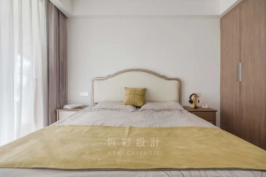 细看床头柜,造型色彩是有不同的,这种差别令其承担实用性的同时也增添了看点。
