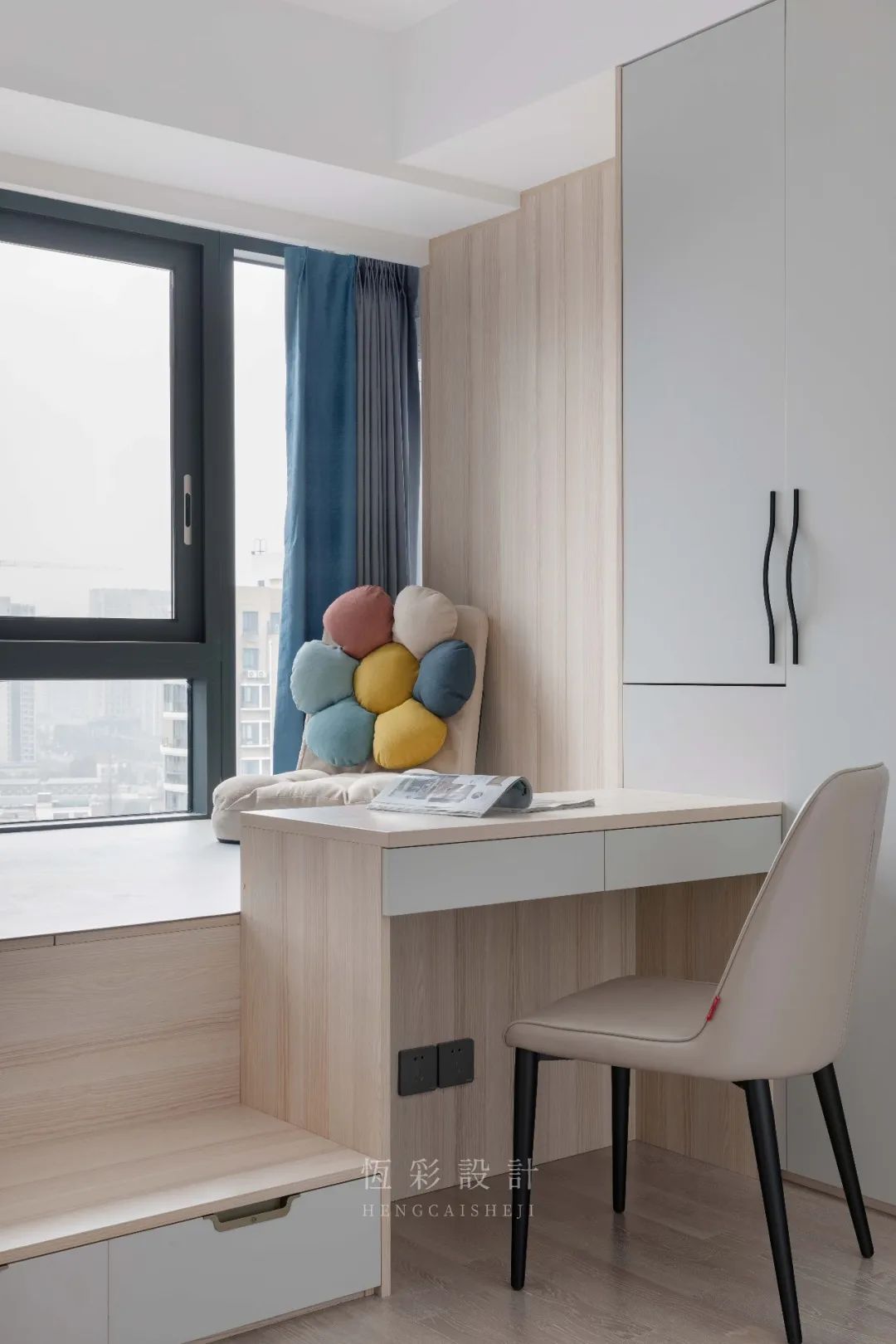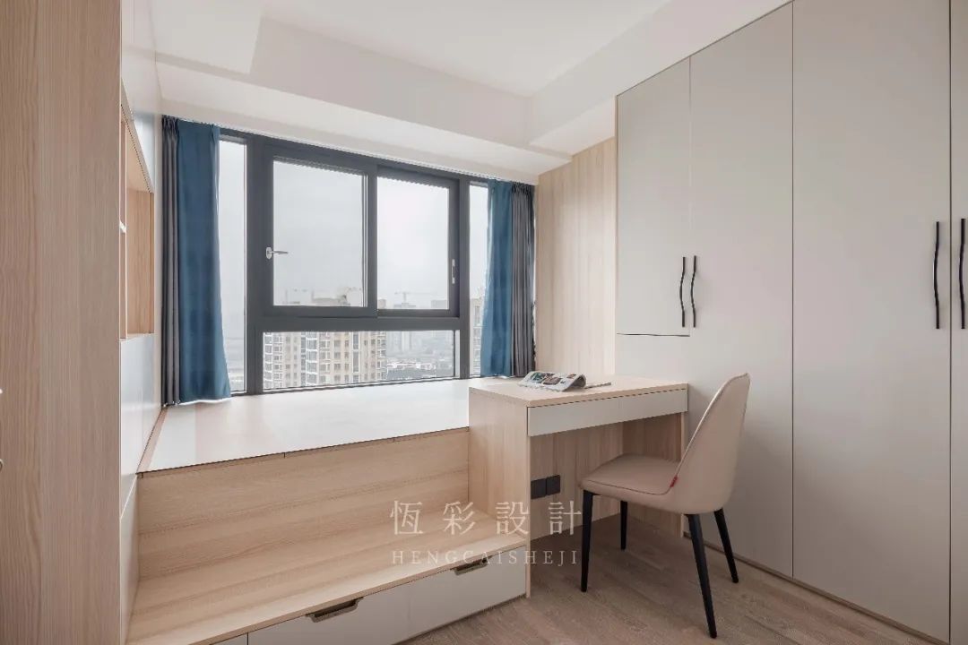 两侧靠墙做充足柜体设计收纳力max。地台抬高,做台阶设计,实用性更高。书桌对窗,景色更佳。