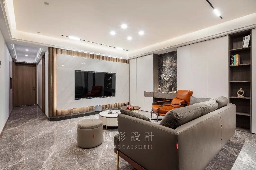 电视背景墙的设计颇具亮点。以木格栅做底,电视机内嵌于一整面的大理石内部,配合灯光带的氛围营造,视觉效果、整体感超强。
