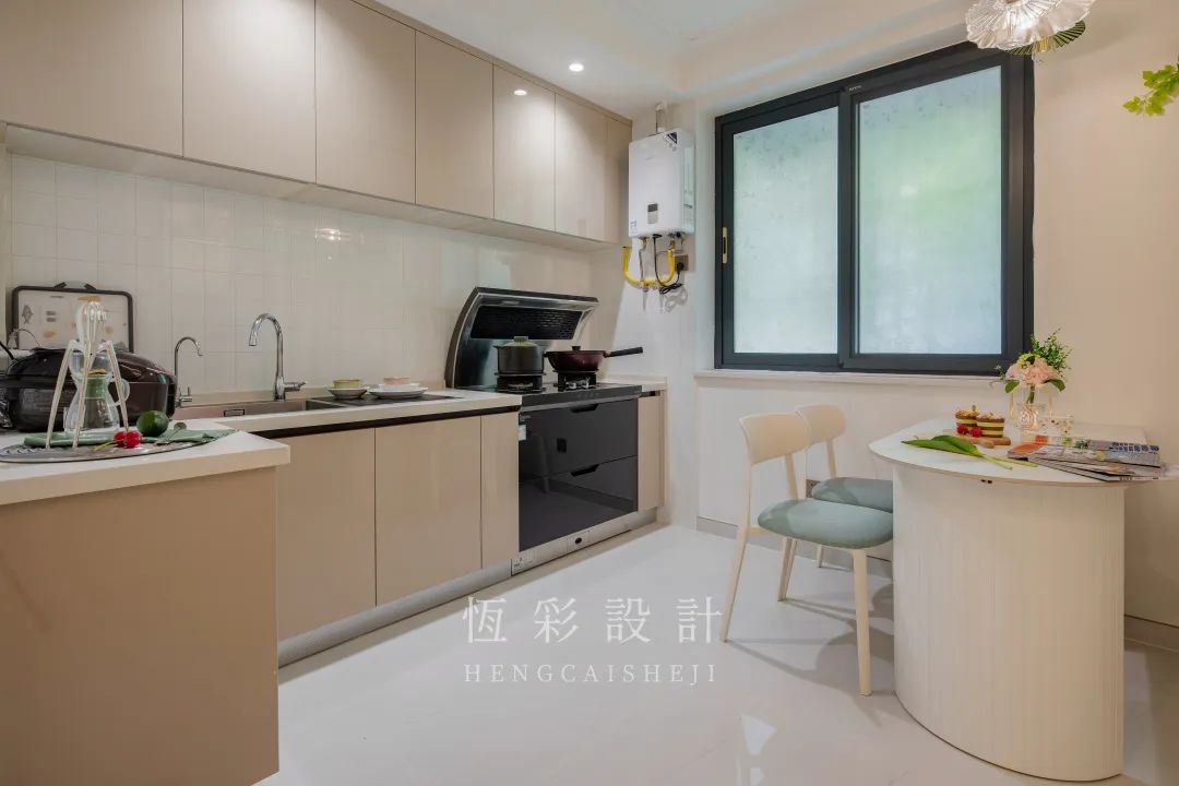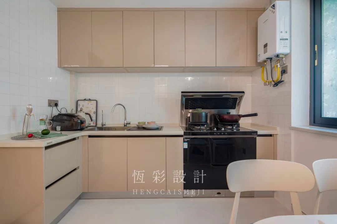 屋主热爱烹饪,平时很少外食,所以厨房的收纳功能及操作台面一定要做足。满墙定制欧派的吊柜和地柜,增加厨房的储物空间, L型厨房设计扩大了可操作的台面空间。