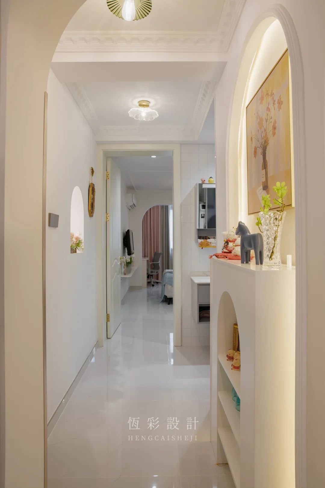 进门增加玄关设计,法式拱门端景台、改造的半拱形门洞、独特法国风情的墙饰等元素,表达着轻法式的高贵典雅。