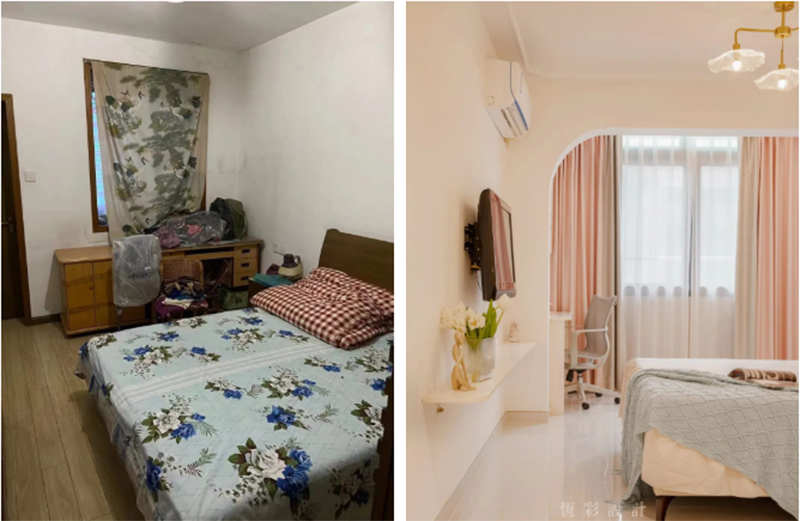 洗烘机器放在玄关后的位置,解放了主卧阳台,拆掉隔墙,阳台大部包进主卧,阳光倾泻而入。
