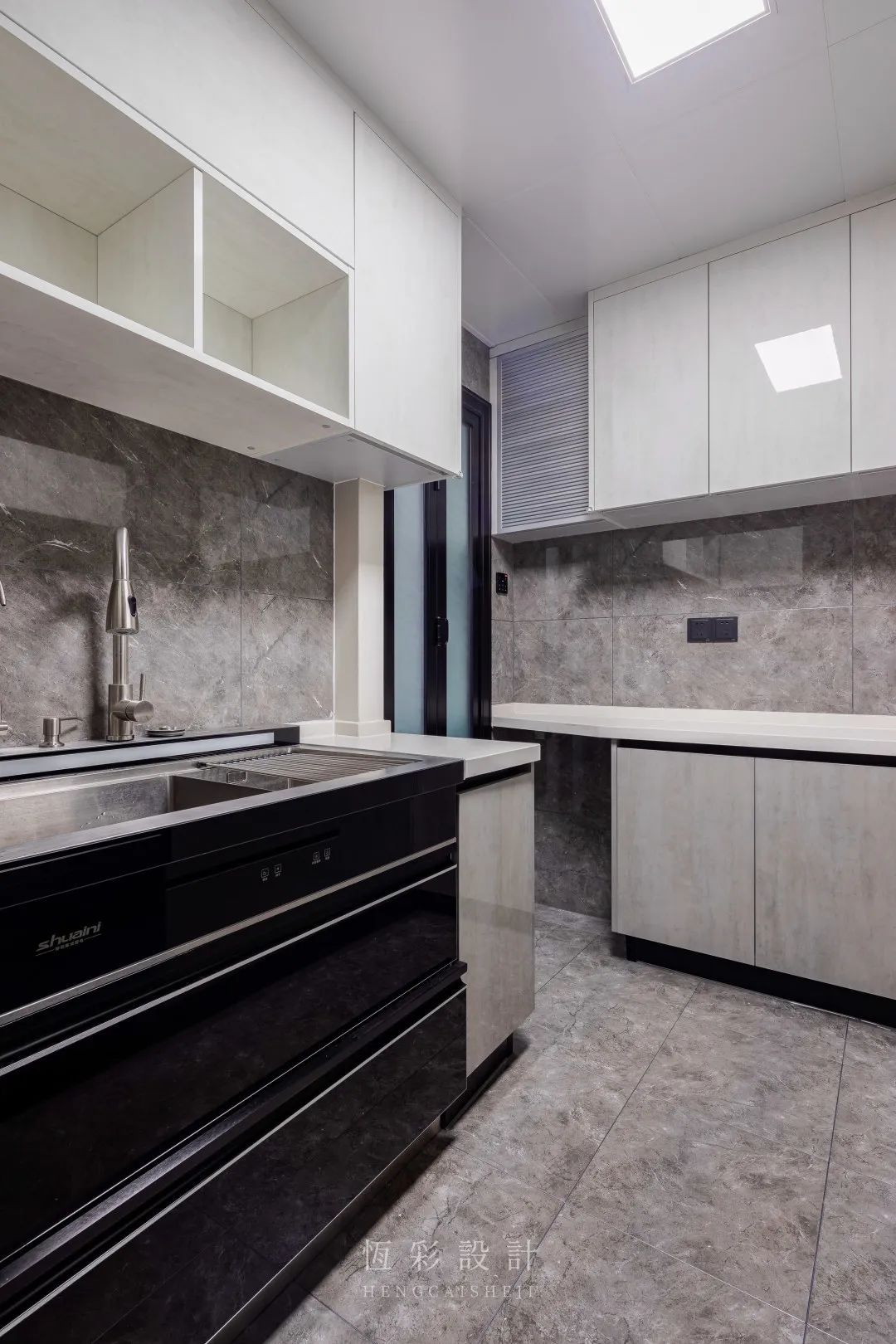 厨房是U字型设计,有充足的活动空间和操作台面,橱柜同样使用亮面柜门,方便清理油污。