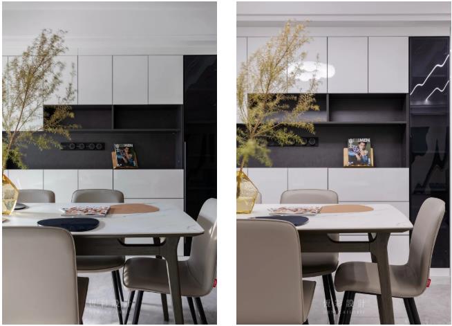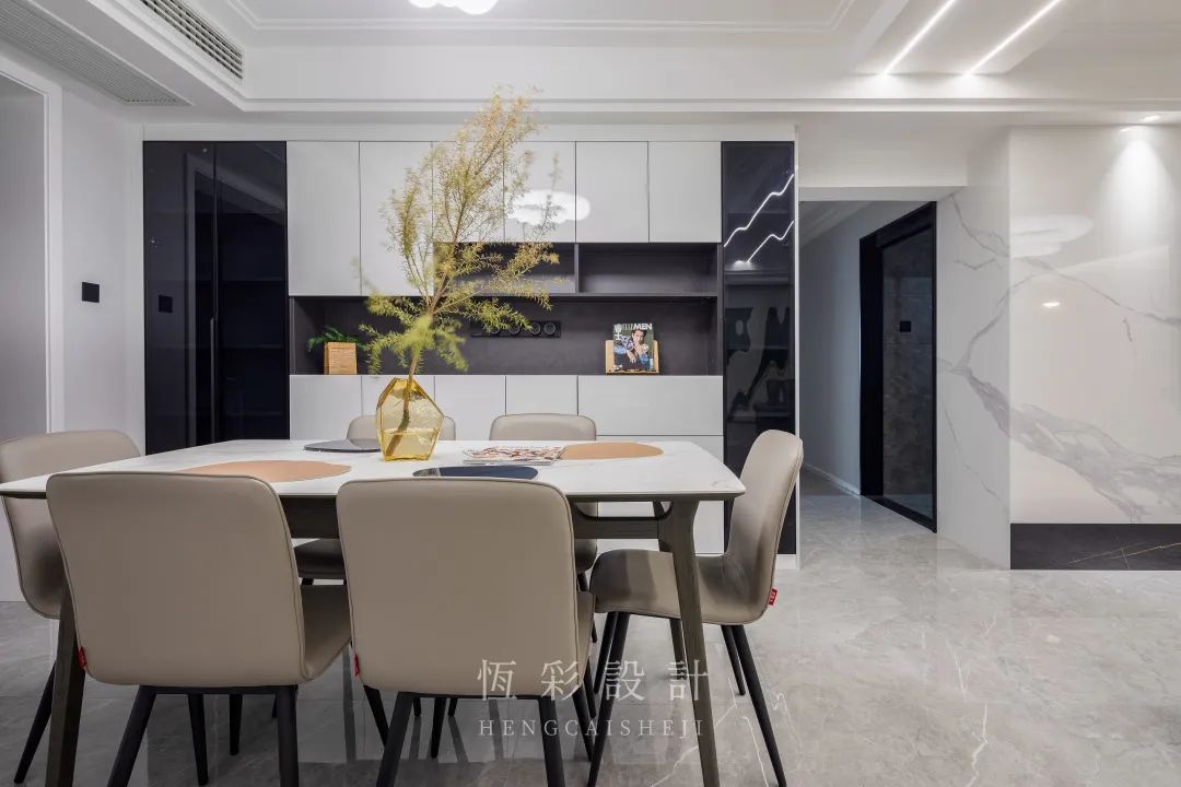 柜门统一白色,餐边柜收纳格与餐椅则选用黑色,视觉上增加层次感又不凌乱。