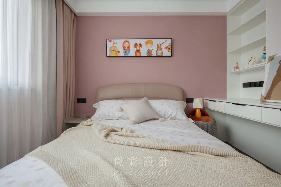 每天辛苦的工作结束后,只想回家睡个好觉,屋主对卧室的要求是温馨舒适。低饱和度的脏粉色内敛柔和,没有攻击性,粉色背景墙、窗帘和床品大面积使用。