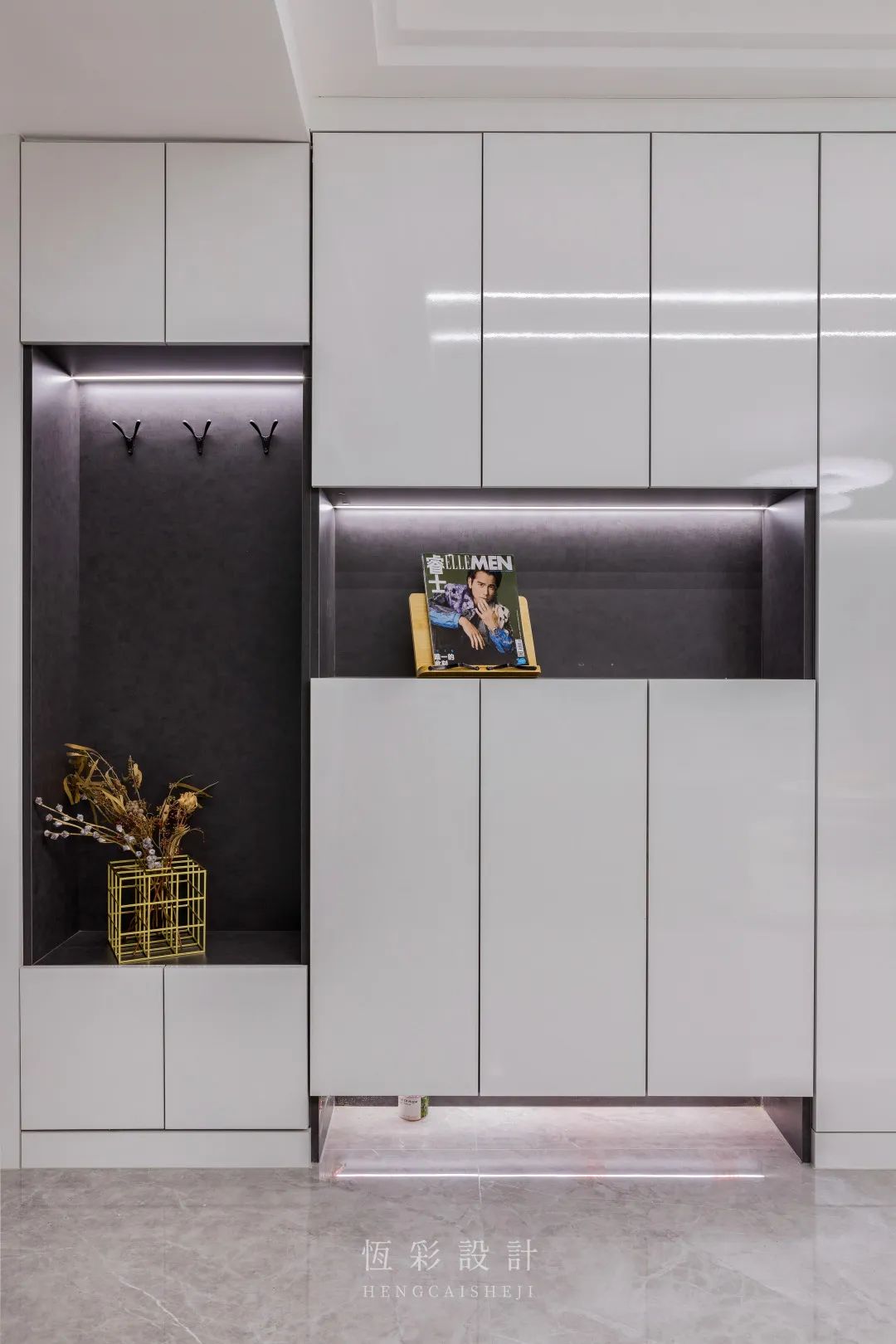 玄关采光欠佳,除了玄关灯之外,还可以定制亮面柜,并设计灯带,光感柜面反射灯光,除了优化采光,还能增加视觉延伸感。