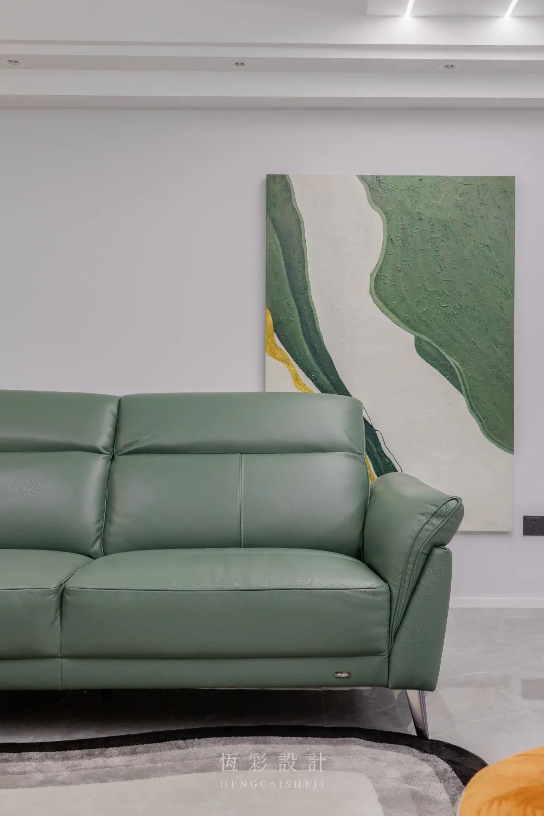 最妙的是这幅落地装饰画,手绘的油画随意摆放,氛围感爆棚,成为绝佳背景,相同的配色构成像是特意为本案客厅定制而成。