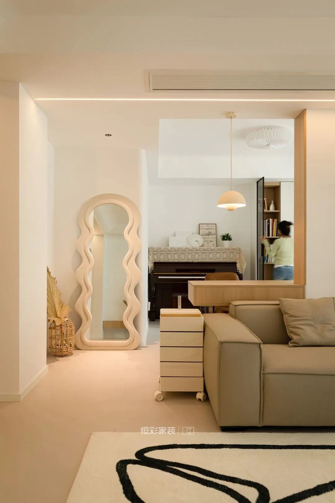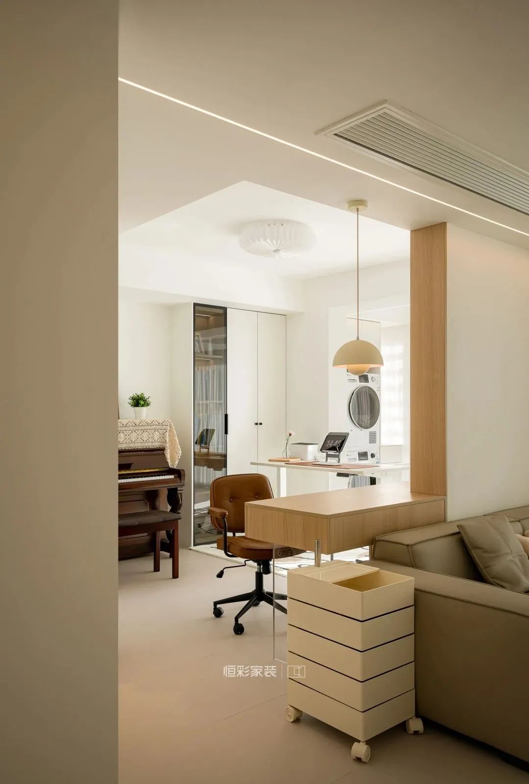 靠墙摆放的古典钢琴,米色镂空复古棉钢琴罩,搭配一些简单的小摆件,艺术值拉满。背后靠墙定制的书桌,还能成为一个独立的工作区域,互不干扰。小拐角空间也不放过,放上当下流行的云朵穿衣镜,既不浪费空间,又很实用。