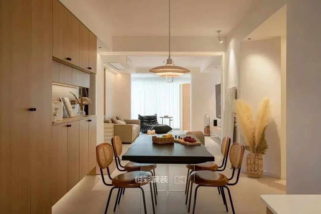靠墙定制整排收纳柜,兼顾玄关收纳和餐边收纳功能。通过柜体的区别设计规划使用功能,镂空+底部悬空设计+整排立柜设计,木色板面保留了原始质感,增加了空间氛围感。