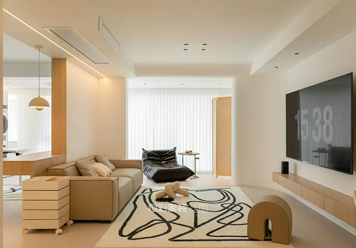 电视背景连接阳台墙体,做了一个弧形的包边处理,将硬朗的线条柔化,更加契合整个空间温暖柔和的色调。简约大白墙背景,靠墙定制悬空电视机柜,简单实用。小方几转移到阳台空间,搭配折叠竹编实木屏风隔断,打造休闲阳台的一方小天地。