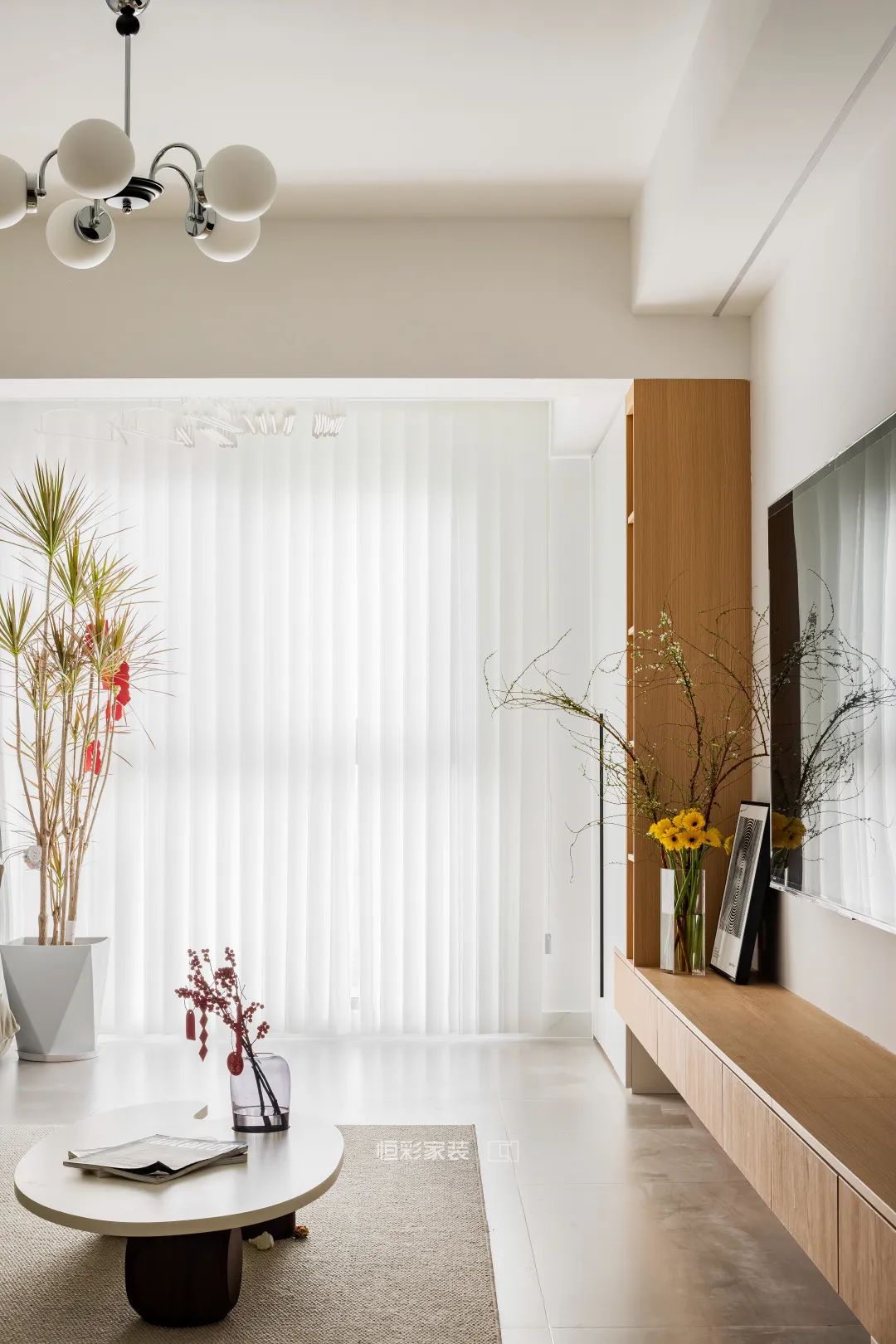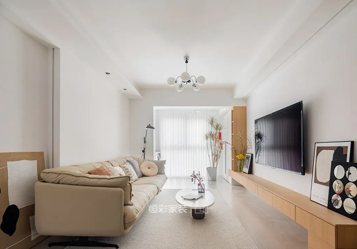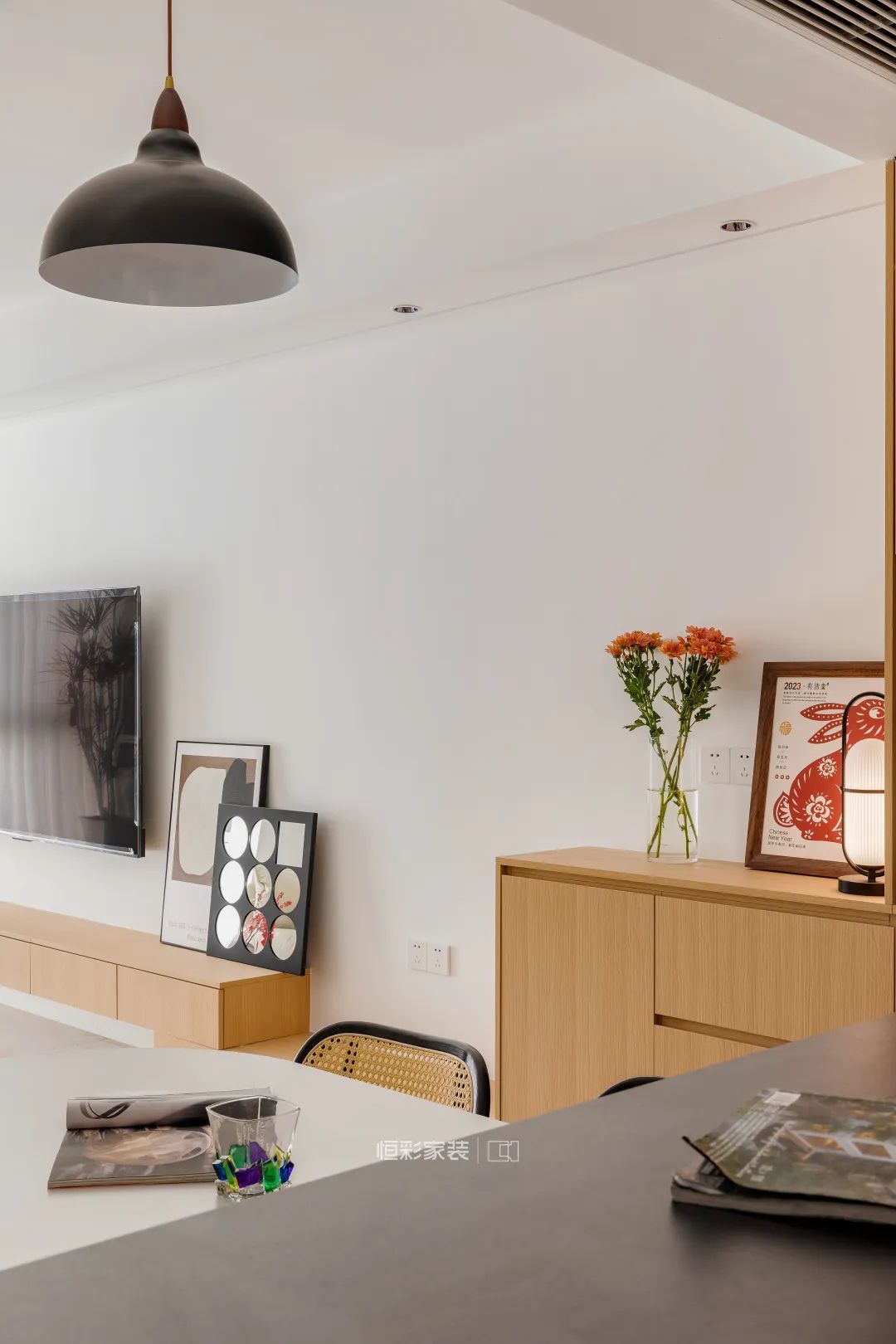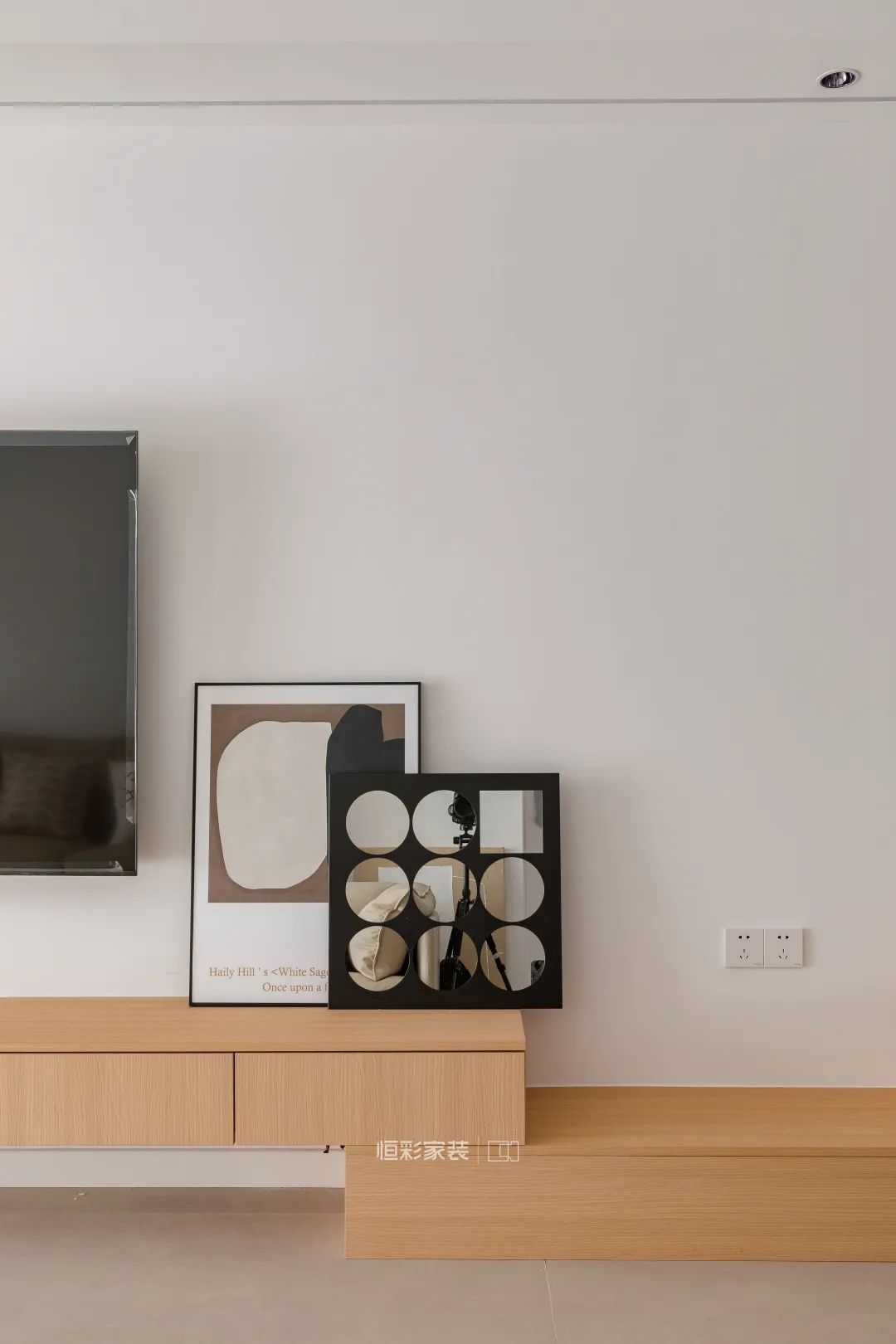 电视机背景选择简单的大白墙,利用原木色电视机柜装点空间的同时,增加储物空间。