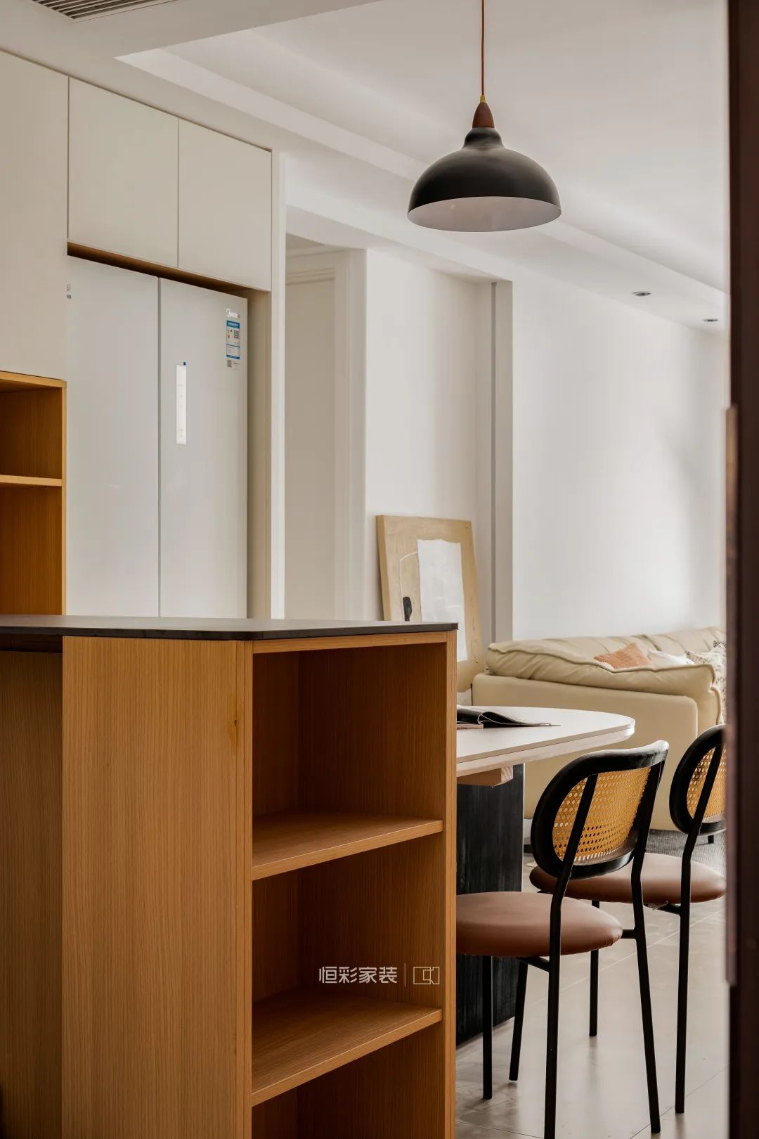吧台柜用作收纳,内置插座,满足日常用餐小电器的使用,非常实用。餐边墙体往卫生间位置内推,嵌入餐边柜和冰箱,白色门规、木色柜体与整体家居风格相呼应,清新美观。