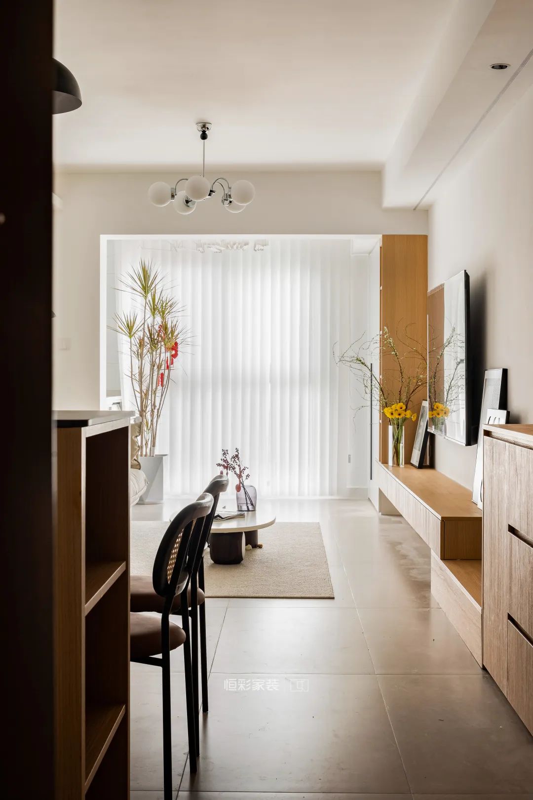 高低台电视柜设计将玄关、餐厅空间很好地进行衔接过度,同时高低错落的设计增加了空间趣味性、设计感。