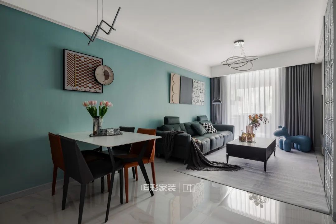 餐厅和客厅位于同一个区域内,蓝色背景墙的延伸放大了整个大空间的视觉感,完善了空间的整体设计感。