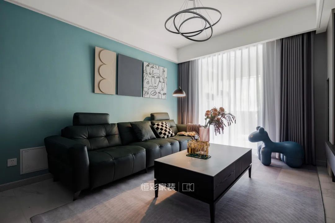 客厅选择蓝色乳胶漆作为主背景装饰色,大面积亮色提亮了空间色彩,在背景色的修饰下,选择饱和度较高的深色真皮沙发作为远近色调和视觉距离感。