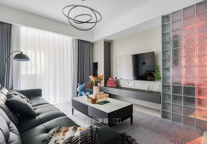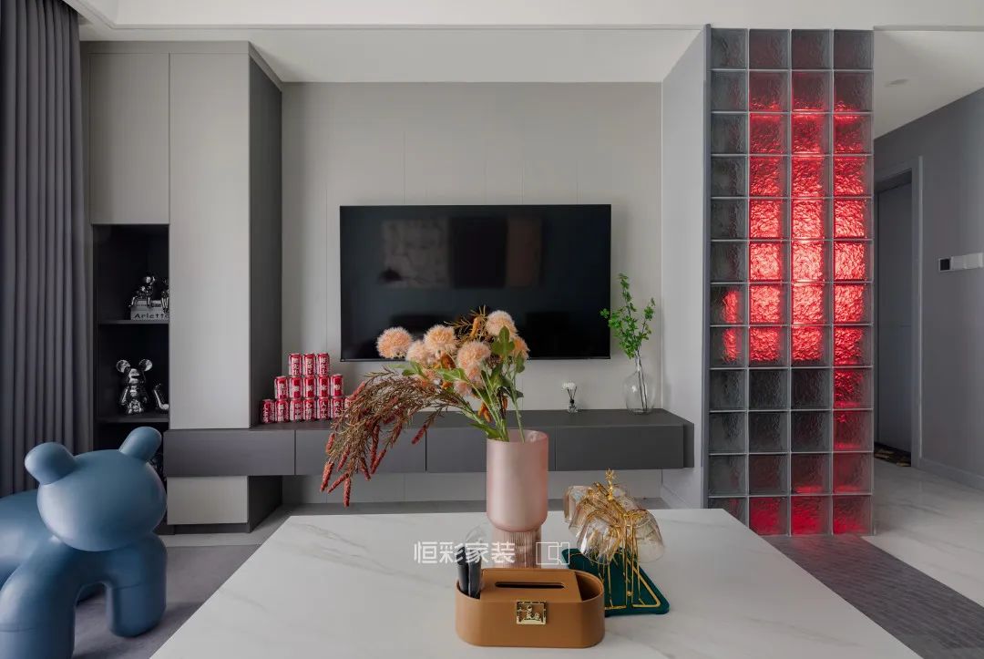 电视背景墙的延伸处作为卫生间干区,利用玻璃砖对干区进行隔断,半透光的材质不影响客厅整体空间的采光,也能减少硬隔断带来的空间封闭感。