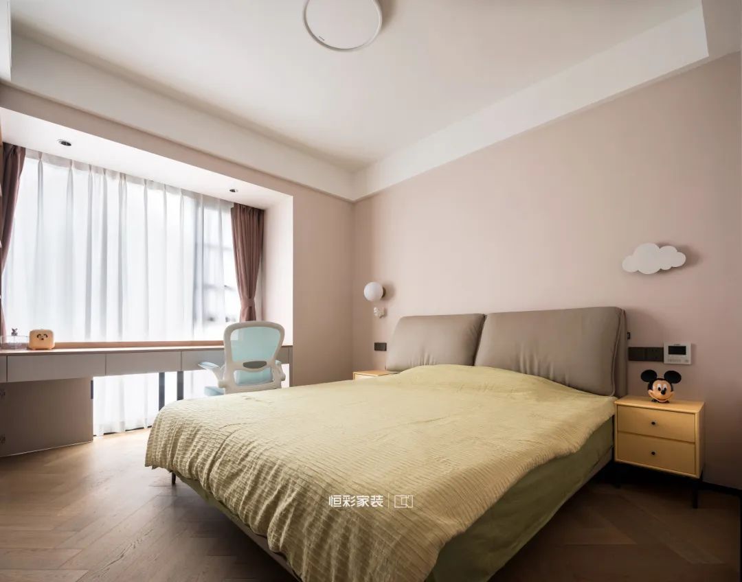 次卧与女儿房那个整体风格相近,裸粉色使整个卧室空间视觉升温,显得十分温柔。