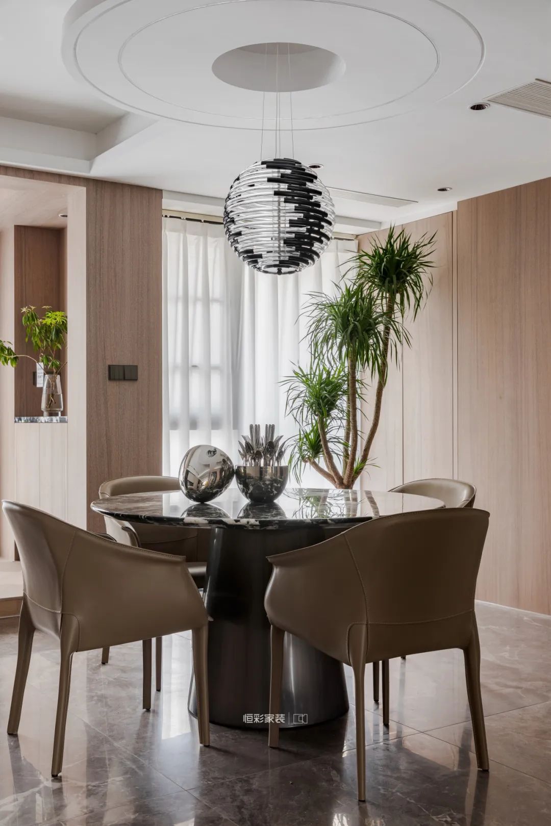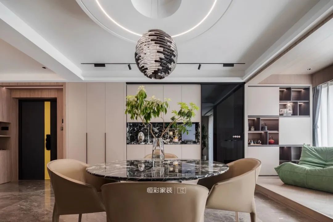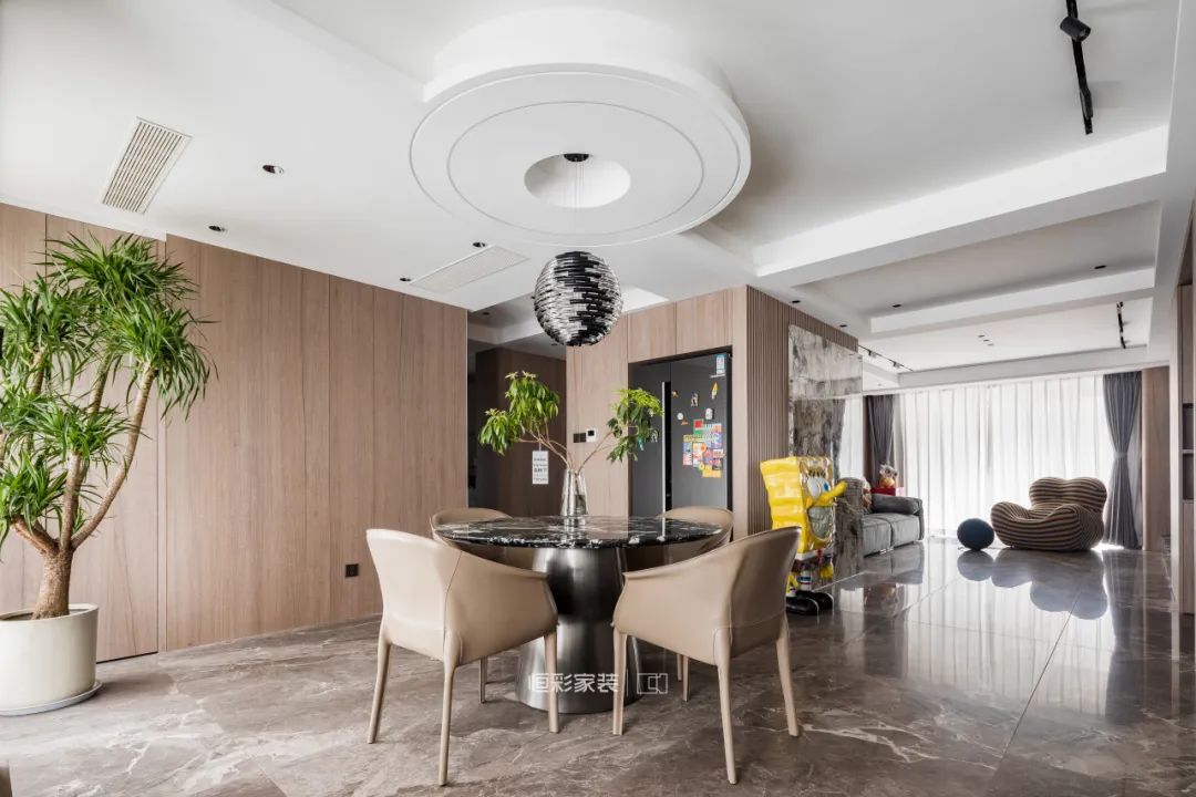 餐厅扩容后成为动区设计一大看点,整体圆形布局给人一种聚合的视觉体验。餐厅处于户型和家庭活动的核心位置,以圆形吊顶、球形吊灯呼应客厅弧形元素,大理石餐桌适配度满分。