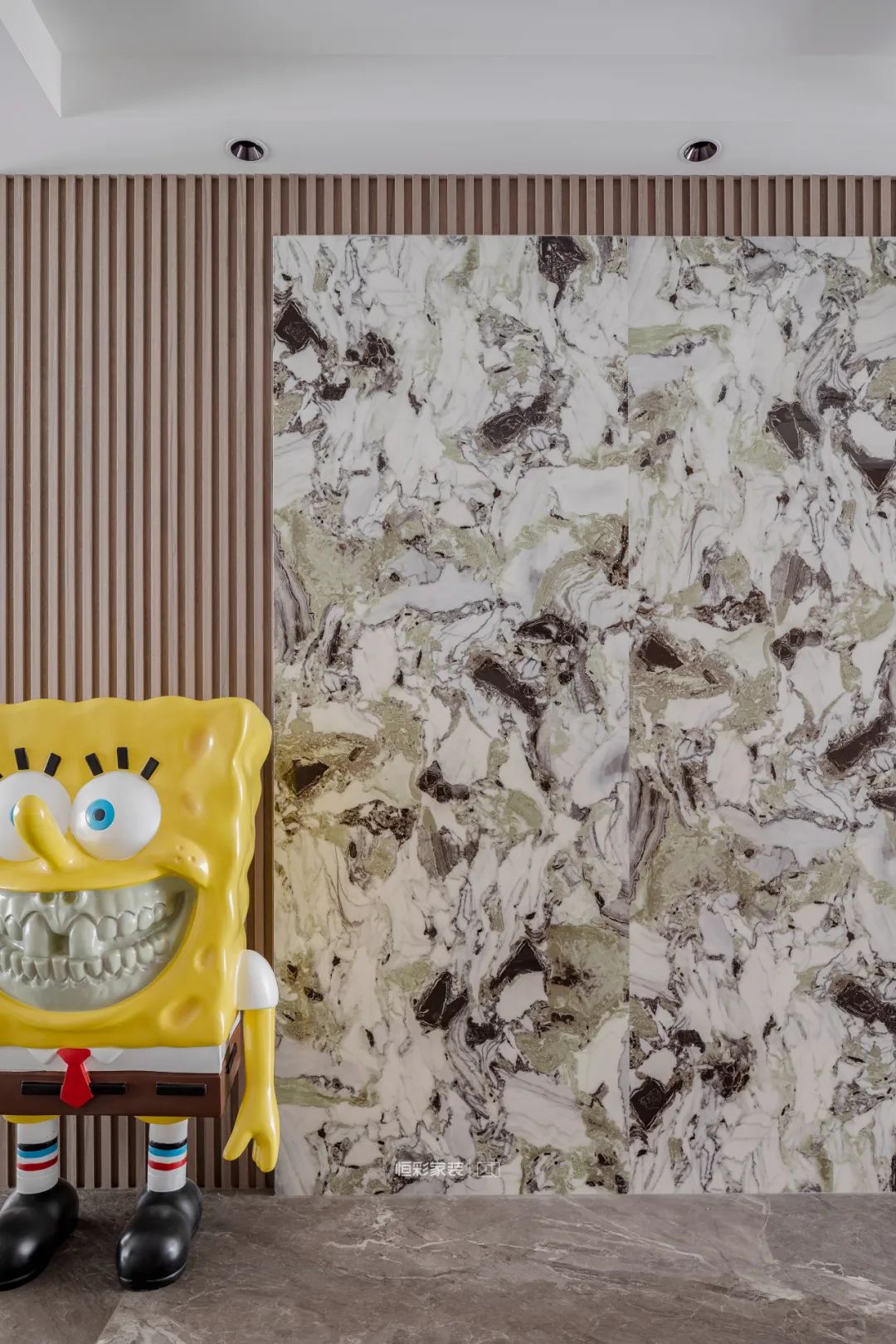 玄关避免了室外直接观室内全景的尴尬,以木格栅为背景拼接大理石造景,入户艺术感拉满,海绵宝宝时时迎接主人回家,俏皮治愈,端景区很好地衔接到客厅区域。