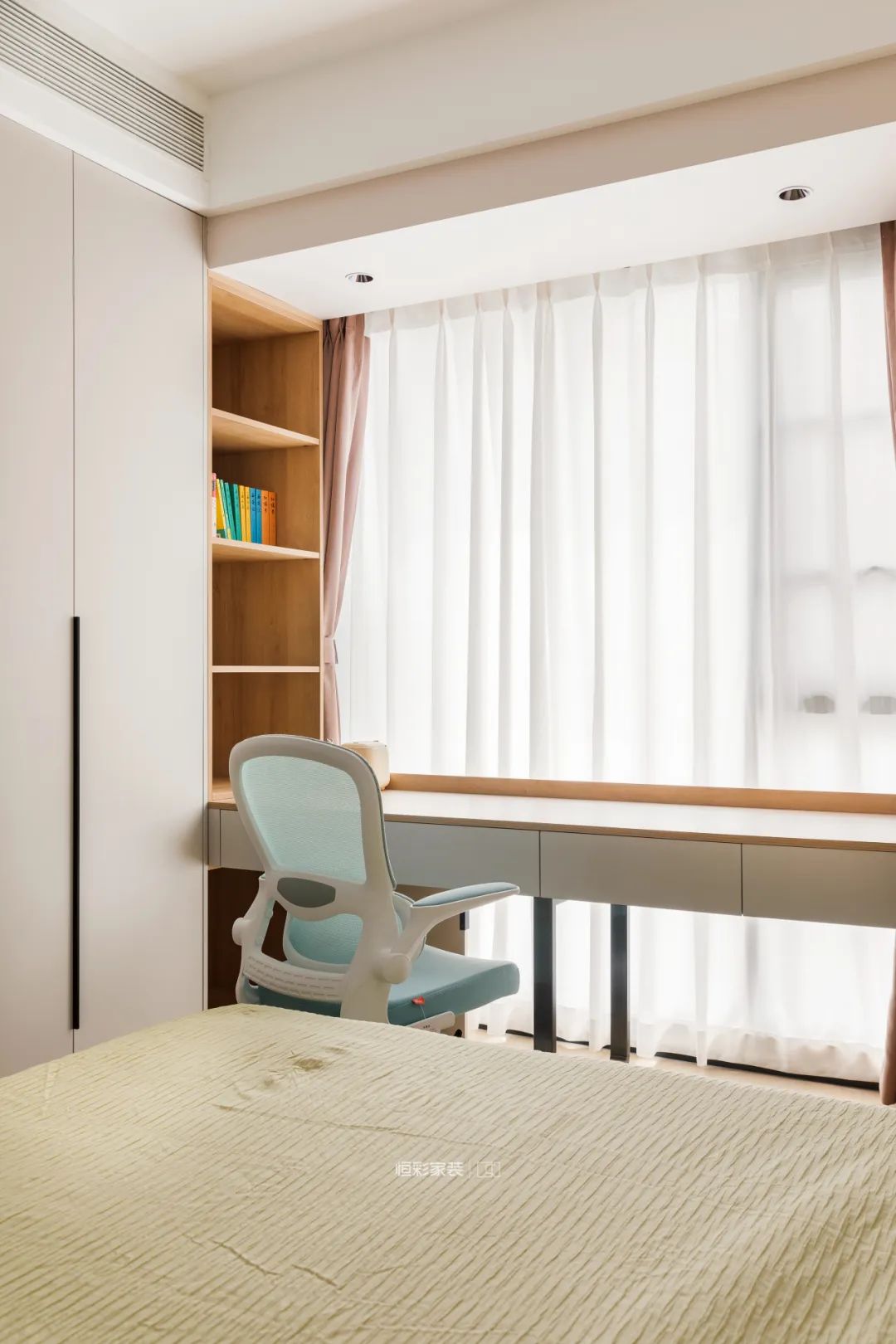 靠墙定制超长书桌柜,满足学习收纳需求,女儿房整体配色浪漫甜美,也是父母对女儿少女心的保护色。