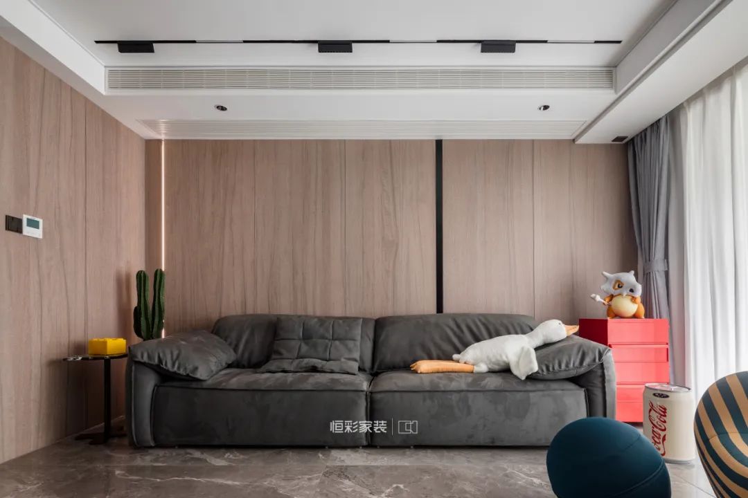 客厅电视背景墙的处理上以统一为核心,木饰面为大背景打底,错层定制柜体再嵌入电视机,转向女儿房隐形门的墙体顺势做弧形处理,打破横平竖直的单调,同时空间的延伸感也有了。