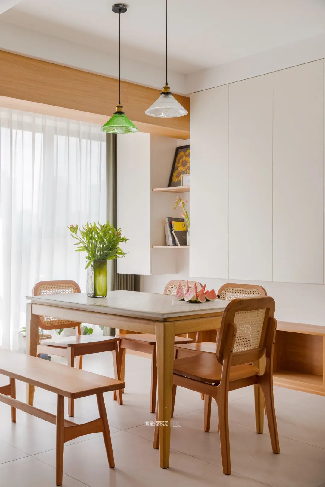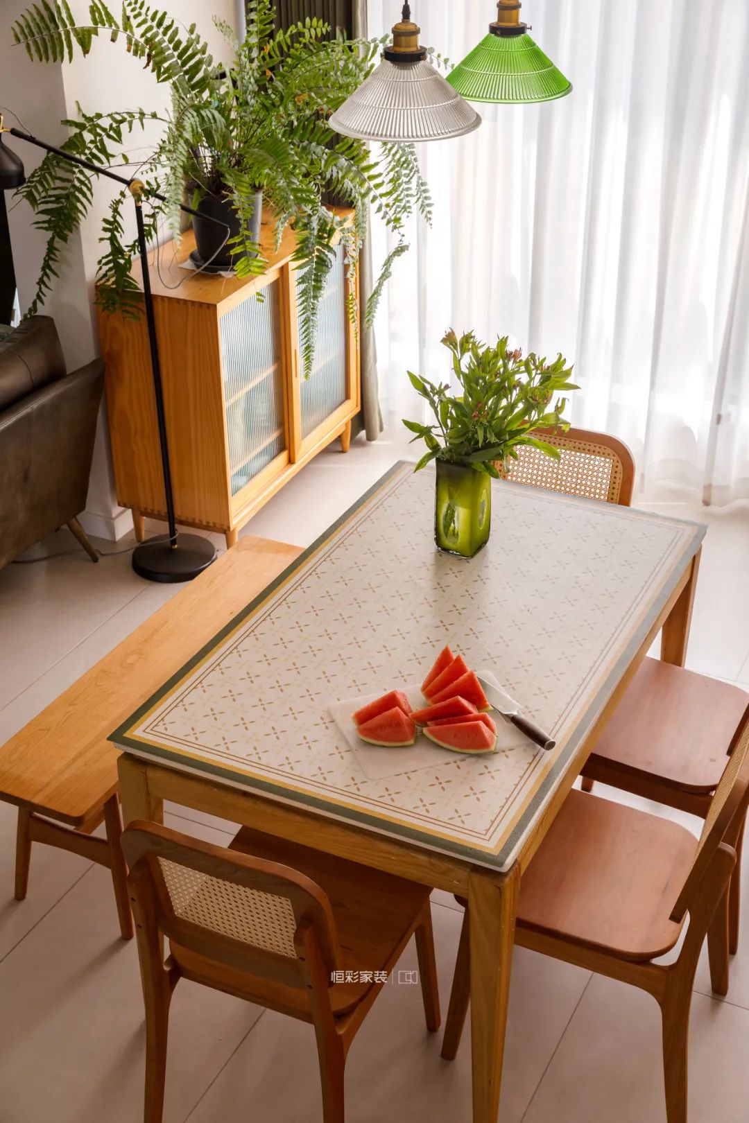 餐厅没有定制餐边柜,半高成品边柜足以放置一些小餐具和小零食,风格上也都是暖暖的复古焦糖原木色,诗意与烟火并存。