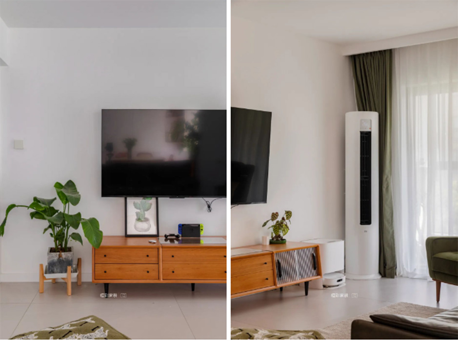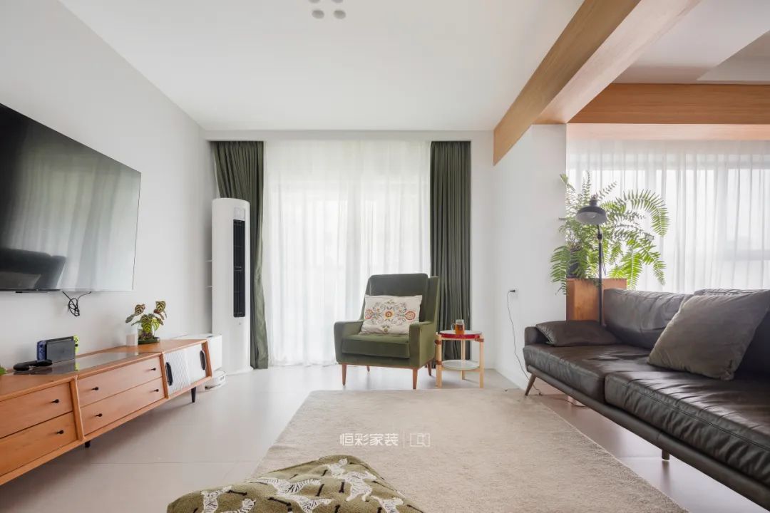 客厅是家人频繁互动的区域,也是亲友来访的主要活动空间,索性去除茶几与多余装饰,大面积留白铺上地毯,夫妇俩可以边观影边聊天,也方便和家里的小宠物一起席地玩耍。