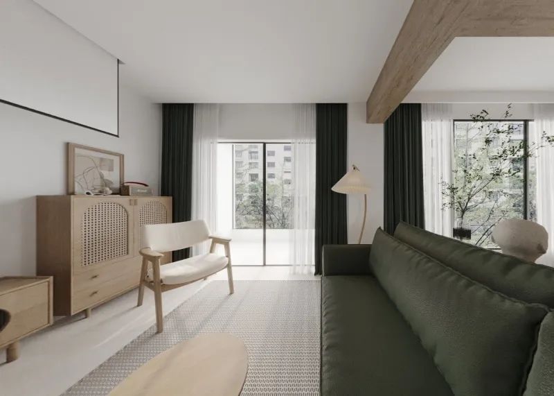 卧室硬装同样以原木+白为主,背景墙不做装饰,原木藤编元素搭配复古绿,起居空间温馨舒适,浮躁的心得以舒展、平静。