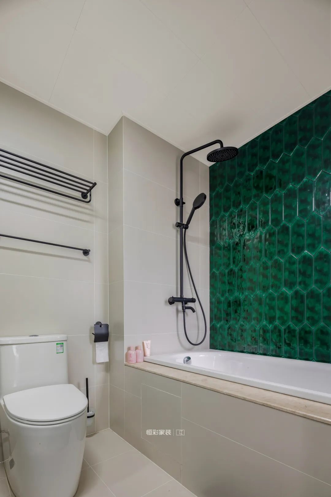卫生间也采用复古绿+白的配色,一楼做了浴缸,墙面复古绿箭形手工砖提升设计感,轻松打造高级感卫浴空间。