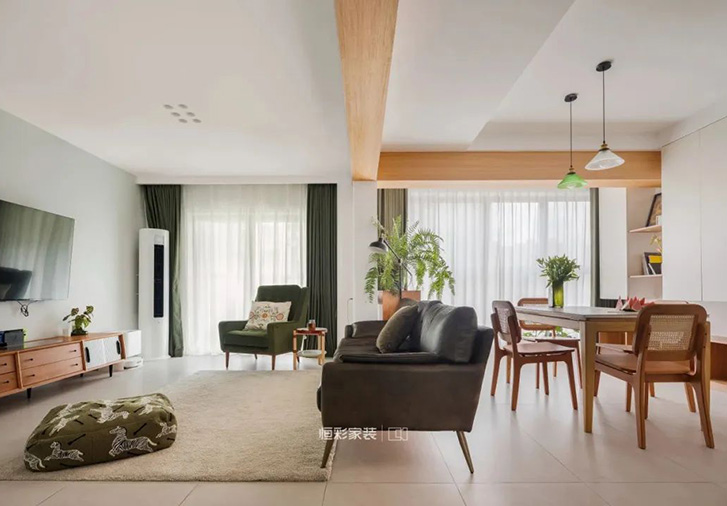 客餐厅一体,功能区保持互通、互动,顶面用木纹横梁为视觉隔断,以大自然的力量打造舒缓调性的中古风,再搭配大量原木家具、墨绿色软装配饰、热带阔叶绿植塑造南洋风的热情个性。