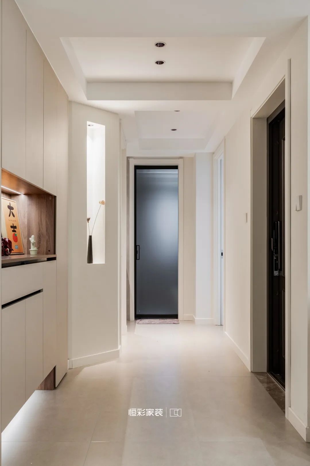 入户无玄关,需“造”出一个玄关区满足出入需求,于对向墙体嵌入式定制玄关柜,借用次卧空间有了玄关柜兼端景区,又能保证门厅足够的活动空间,再设计斜切墙体过渡到静区;