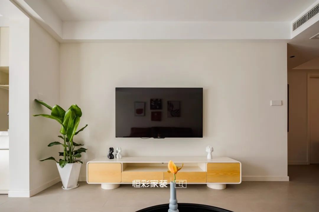 电视背景简单处理,与空间形成和谐的连贯感,暖色调的软装搭配使整体空间更加简洁利落。