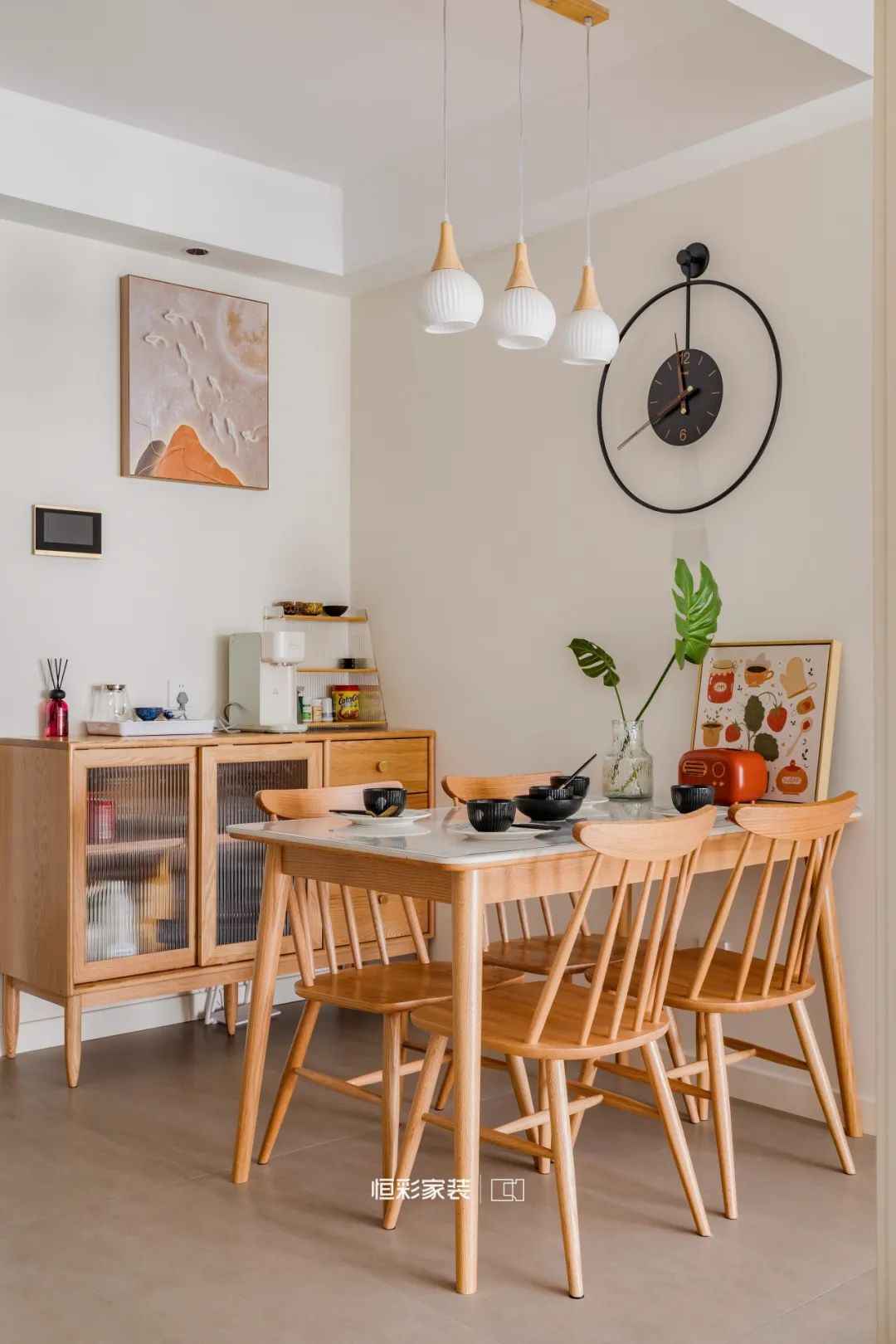 餐厅位于进门左侧,整体浅色原木格调的餐厅真正做到小而美,低矮的成品餐边柜既能满足实用需求,本身也是一个貌美的展示型小家具~