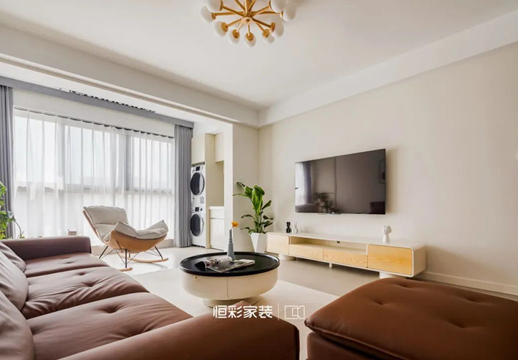 客厅装修以奶白色为主,以清新简洁的氛围引领全屋设计。大平顶营造出轻盈自然的空间氛围。
