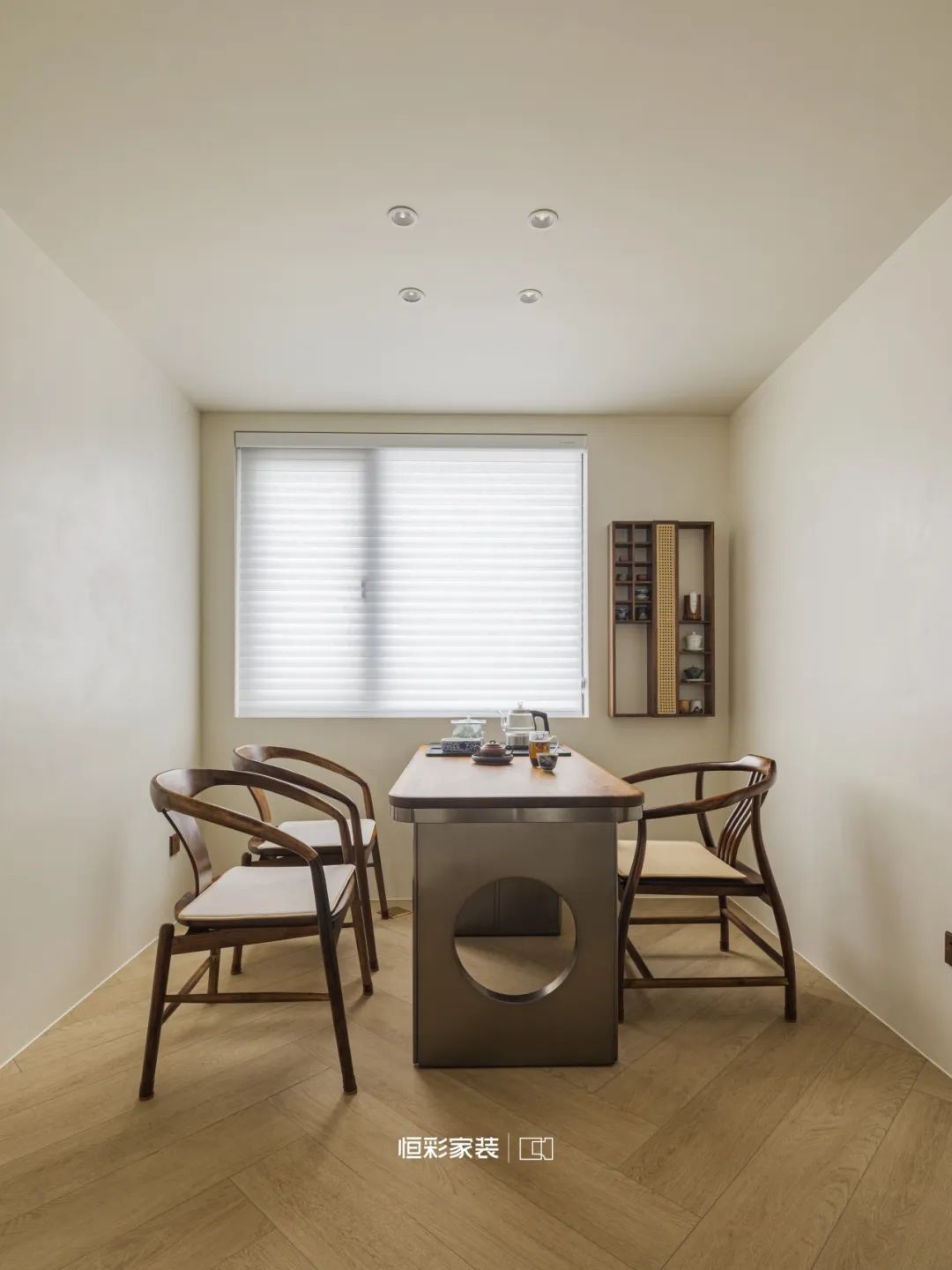 次卧作为长辈房使用,简单的微水泥像是被时光轻抚过的画布,铺上一层温馨的底色,咖色墙裙抚平每一缕思绪,不显尘世喧嚣。
