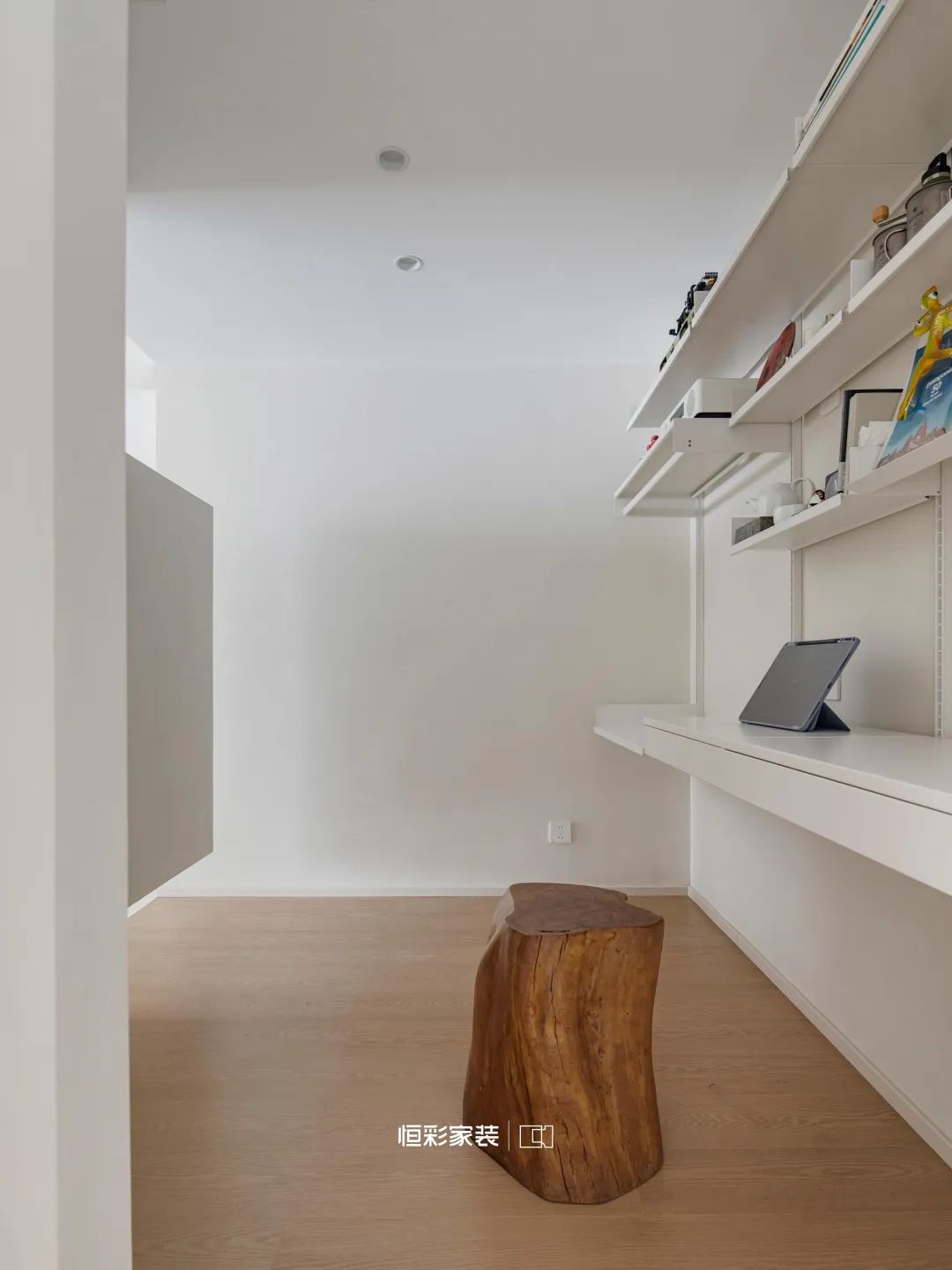 玄关之后,地台之上,留白之处,时间停驻,白色书架静静守护这个角落,让人在喧嚣中寻觅到一处安宁净土。