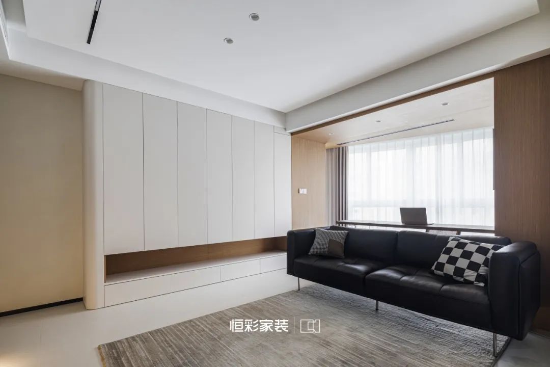 黑白灰最纯粹的色彩,轻轻拂去喧嚣,客厅已无茶几的繁复,高脚真皮沙发宛若深夜天幕,安静深邃,轻柔投入纯色地毯的怀抱。
