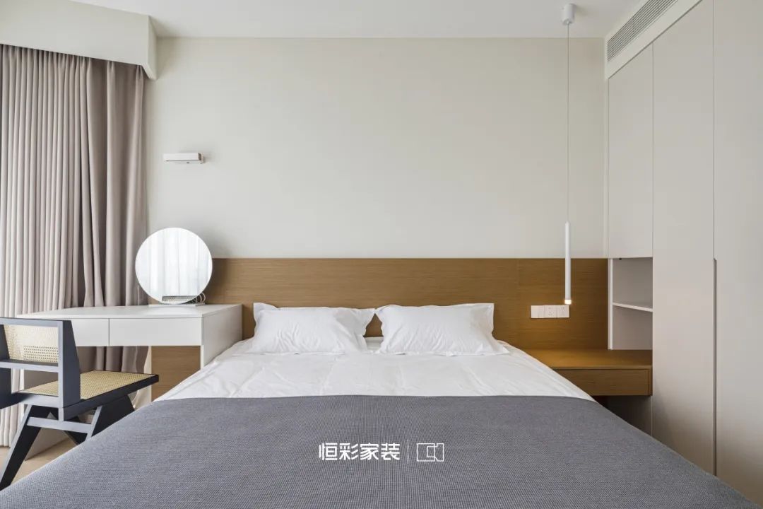 淡墨轻烟的晨光里,次卧风格与主卧一脉相承,又独有几分恬静,设计师以轻柔的灰白为画笔,地台式榻榻米结合书桌一体绘出一片宁静。